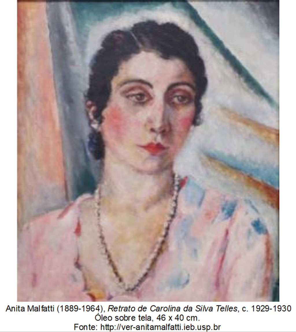 21. Um exemplo é o retrato de Carolina da Silva Telles [ Figura 3 ]. Carolina era filha da famosa mecenas do campo artístico de São Paulo, Dona Olívia Guedes Penteado,[6] e esposa de Goffredo da Silva Telles que, em 1932, se tornaria prefeito da cidade de São Paulo. Carolina, ao recontar como seu retrato foi realizado, menciona um incidente em que interveio junto ao Mackenzie College para que Anita fosse contratada como professora. Desta forma, é possível visualizar os processos de negociação que Malfatti estava inserida dentro de seu campo social.