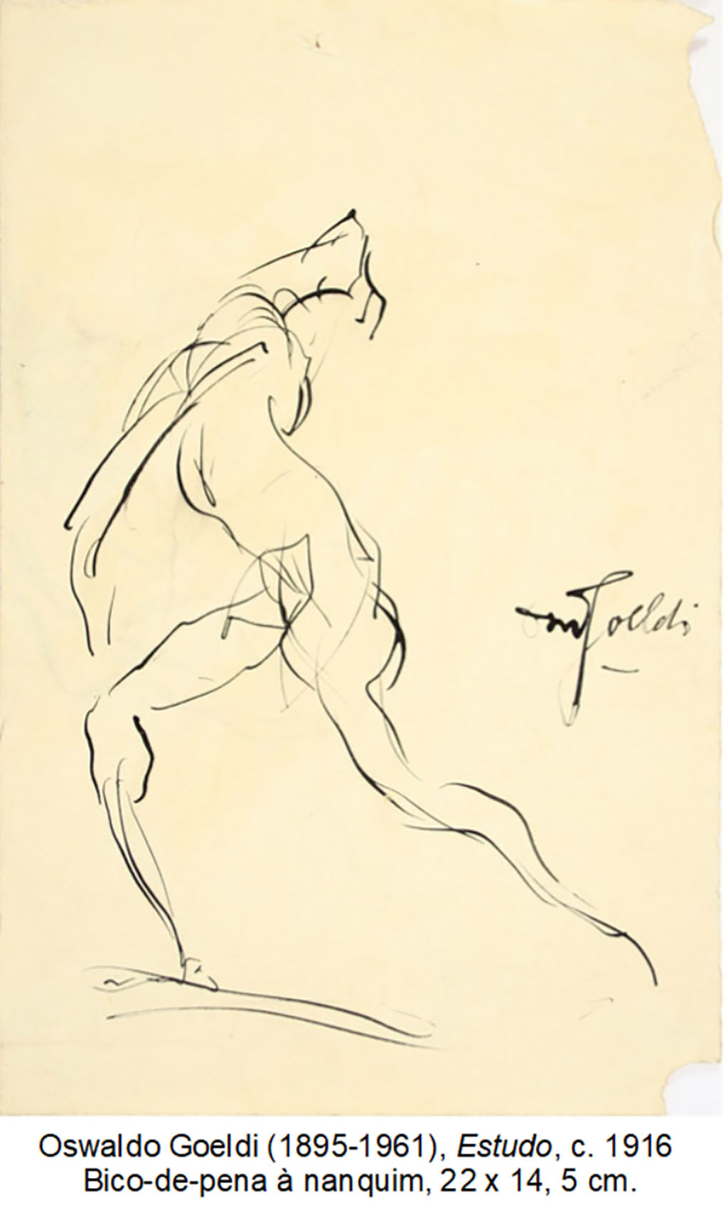 30. A partir dessa concepção observamos que Goeldi manteve em alta conta esse dinamismo, o que nos parece explícito em alguns desenhos como em Estudo [ Figura 1 ]. Na caligrafia rápida se estabelece o ritmo geral, sem a preocupação do uso da linha como contorno e os dados anatômicos não se definem senão como sugestão. A figura é estruturada a partir de uma dinâmica da própria linha, como um movimento que se dá na superfície do papel e, desse modo, podemos sentir a vitalidade expressa como um dado elementar do desenho. No conjunto das pulsões, as linhas formam sequências que se organizam como fluxos direcionais, a exemplo do encontro dos dois arcos, que criam uma forma pontiaguda e atrai nosso olhar para o vazio do canto superior direito. O curto intervalo entre um traço e outro indica um fluxo que dispensa o cálculo, ao mesmo tempo que estabelece uma caligrafia dinâmica onde o movimento emerge como tema principal do desenho. E isso se configura pela similaridade e variações das pulsões nervosas que coordenam as ações da mão sobre o papel.