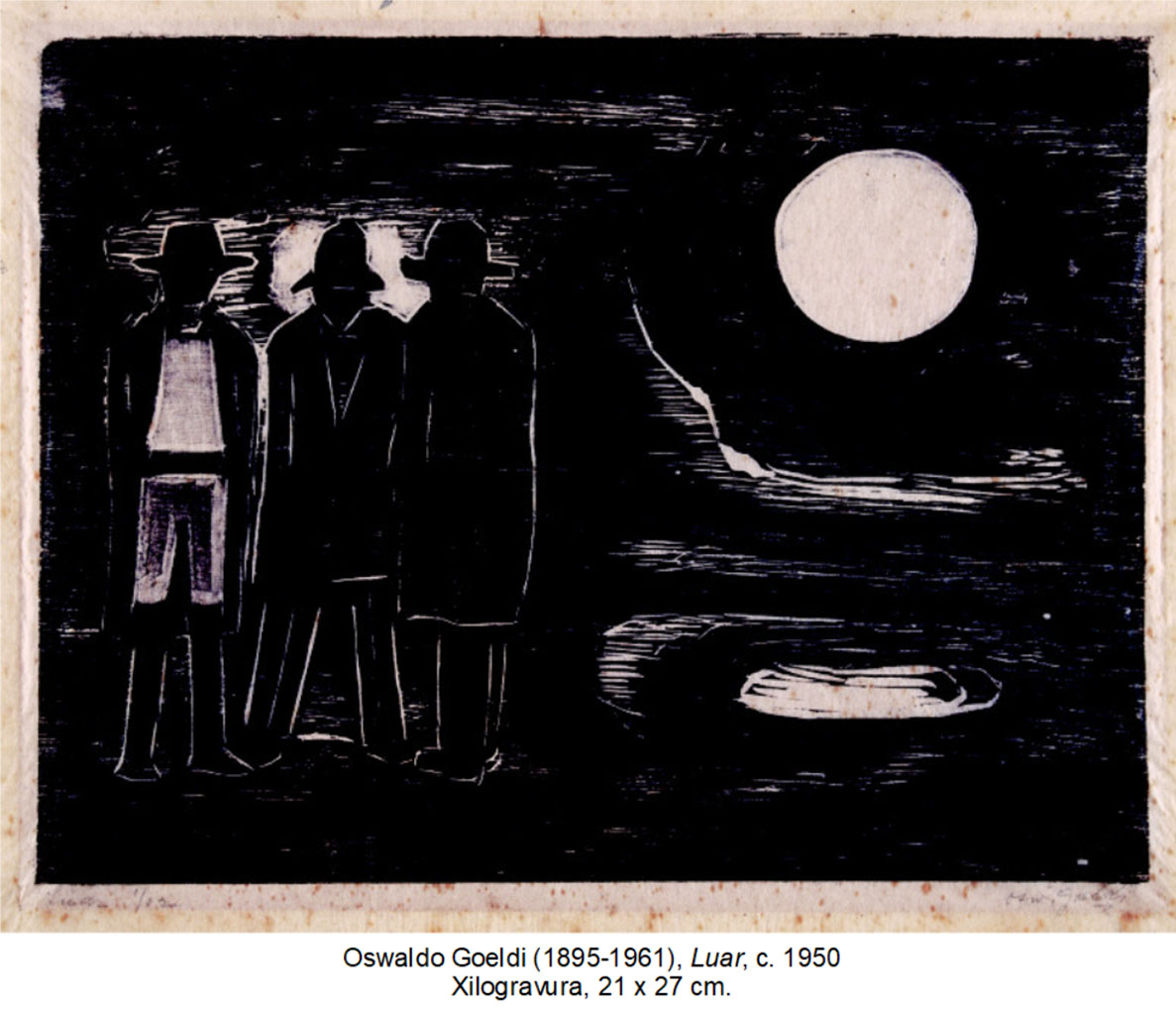 42. Resulta da compreensão em relação ao meio expressivo o modo seco com que as figuras surgem, sem qualquer espécie de sentimentalismo, a exemplo de Luar [ Figura 3 ]. Toda a execução da obra é acompanhada de uma certa abstenção, um dizer pouco que abre vias à imaginação, em manifesto mistério. A imagem resulta do encontro de dois momentos justapostos, de um lado o grupo de anônimos, cujas faces abrigam apenas a noite absoluta; do outro a lua, grande e plena, cujo reflexo revela as águas imóveis da noite onírica. O silêncio é intensificado pelas formas estáveis e os vazios que intercalam os acontecimentos na composição. Sua carga expressiva está justamente na não afetação dos gestos. Há um teor melancólico na obra de Goeldi. É “na redução formal que ele faz da variedade fútil da vida um mundo de poucas referências.”[36] Em Goeldi toda experiência formal se refere à dura realidade transfigurada, em oposição ao caráter evasivo de muitas obras produzidas no interior do modernismo. A sua marginalidade no cenário cultural da época poderia se justificar por terem em alta conta a exaltação de uma brasilidade a partir de um sensualismo telúrico? É sabido, contudo, que artistas e intelectuais, como Manuel Bandeira, Oswald de Andrade e Carpeaux admitiam nele uma presença verdadeira e intrigante.