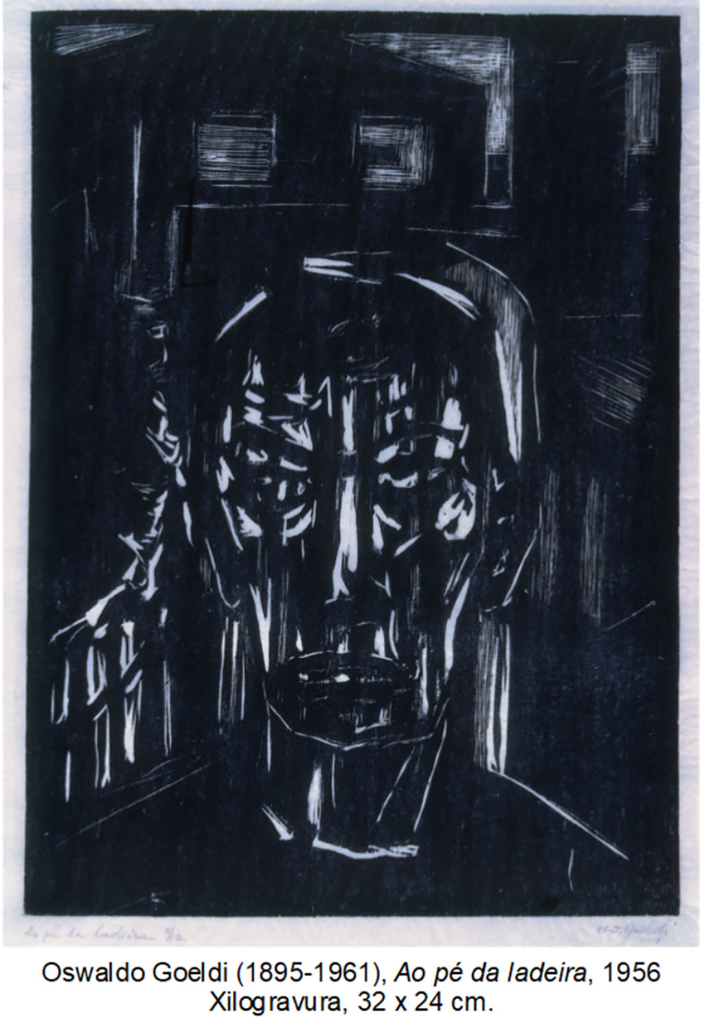 44. De modo diverso, Goeldi se expressa ritmicamente em Ao pé da ladeira [ Figura 5 ]. Um ser degenerado de aparência cadavérica fica sugerido nos planos irregulares. Uma luz suave, produzida por suaves filamentos, define a geometria das janelas e do pequeno pedaço de céu, formando um momento estável da cena, e contrasta com os brilhos imprevistos francamente abertos, conferindo a ela uma atmosfera seca e dramática. A configuração abre-se para o vazio que ocupa os intervalos intocados pela goiva. De tais brilhos emergem planos como que lapidados pelo gravador. A face frontal, revelada pelos fechos de luz que incidem verticais sobre seus planos irregulares – que impõe aos olhos o sentido de queda – emerge como um paradoxal retrato de um ser esfacelado ao pé de uma ladeira. A obra demonstra a maturidade do pensamento plástico de Goeldi. A matéria plástica é articulada de forma primorosa nos traços carregados de força expressiva. Não há obviedades na execução e só poderíamos nos deixar enganar pela aparente arbitrariedade de suas linhas se tal comoção não estivesse relacionada a um senso imaginativo profundo. Nota-se sobretudo uma tensão entre a continuidade da forma estável e a fragmentação acentuada, criando um retrato dominado pela obscuridade.