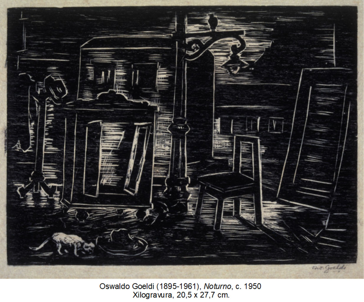 10. Uma técnica rudimentar, como a xilogravura, exige do artesão uma participação verdadeiramente intensa com o meio plástico. O gravador deve saber tirar partido do corte, criar soluções diversas dentro de um universo restrito de possibilidades. Goeldi teve pouca ajuda no decorrer de sua vida para conquistar sua cidadania no meio plástico apresentado a ele por Ricardo Bampi em 1923. Seu aprendizado se fez na aplicação insistente e sincera da prática. A felicidade trivial, baseada no resultado seguro das formulações prontas, era certamente indesejada por um espírito que ansiava por expressão. Tal fato significava para ele um embotamento criativo, como declarou tardiamente em entrevista ao jornal A Manhã: “Não fiz da gravura uma forma mecânica; ainda tenho esperanças, faço descobertas e gravo com a mesma satisfação de há 40 anos.”[11]