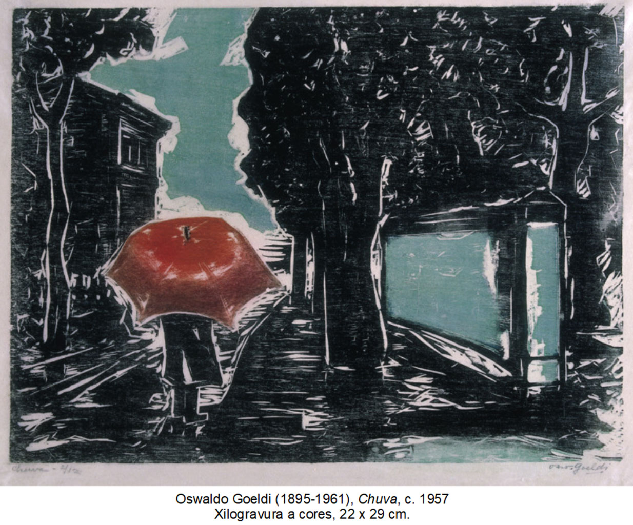 74. Participamos de sua vacilação perante a realidade do mundo, como observamos em sua enigmática obra Chuva [ Figura 10 ]. A cena suscita a perplexidade de um indivíduo voltado contra o muro em um dia de chuva. Em geral, é possível ver no transeunte goeldiano um ser recolhido em si mesmo, indiferente ao seu entorno, e a vida reduzida à repetição de trajetos aparentemente arbitrários. Simbolizam o tempo destruidor, que consome a vida a olhos nus. Este, porém, imprime claramente uma atitude diversa. O mundo é visto como que pela primeira vez em um tempo suspenso, é horror. A obra intriga pela presença de um fantástico guarda-chuva vermelho com o qual se abriga o anônimo petrificado – ou seria o próprio artista? De todo modo, são ostensivos os empreendimentos do gravador no intuito de elevar o guarda-chuva ao estatuto de uma super-realidade. O modelado produzido na fusão do vermelho com o preto faz com que o utensílio pareça pertencer a uma dimensão distinta ao do homem, então integrado à paisagem. Ficamos aprisionados por todas as dúvidas e expectativas.