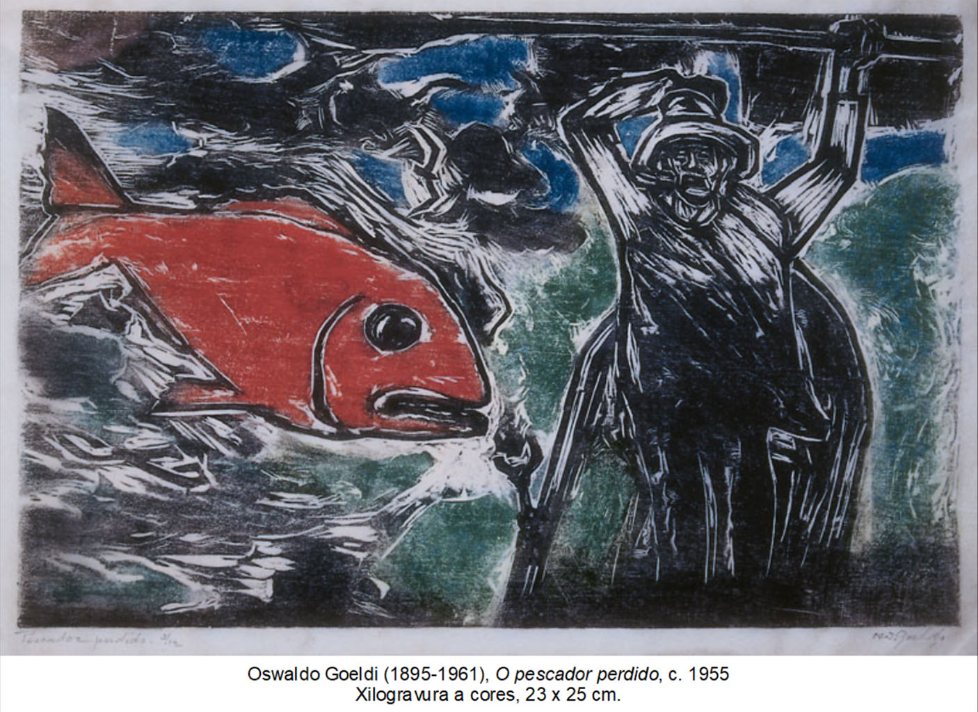 81. São inúmeros os poemas dedicados à fúria marítima. Na pintura do século XVII e XIX, a exemplo de William Turner e seu mar pulverizado em tormentas, de Eugène Delacroix e suas cenas bíblicas, de Théodore Géricault e sua trágica A barca da medusa, tornou-se expressiva a recorrência temática da revolta oceânica. Tal interesse se dá pelo caráter revelador do mar como uma força psíquica, como uma extensão da alma. Em O pescador perdido [ Figura 15 ], vigora mais uma vez a ambivalência entre claustro e imensidão. No mar de horizonte incerto, um pescador ergue seu remo em desespero, como quem vislumbra em um relance seu destino trágico. Um peixe vermelho, de proporções hiperbólicas, imprime à cena o tom delirante dos medos primitivos, de uma intimidade em conflito.[54] Dada a inviabilidade em fixar um ponto para o observador sob uma única linha de visada, como em um labirinto de espelhos, as figuras emergem e engendram na superfície um espaço fragmentado e onírico. Cada figura é um momento e seu conjunto é o espetáculo do caos oceânico com sua desproporcionalidade grotesca. Goeldi faz a imensidão se contorcer ao redor das duas figuras dominantes. Interrompida a linearidade do discurso de ordem natural a todo instante, uma narrativa prosaica não se sustenta – senão pelo simples sentido de uma pesca que malogra. Na cena em que há desejo, temor e desorientação, surge uma paisagem que amedronta pelas metáforas de cólera que realiza. A divisão compositiva em balança, ao modo dos pintores antigos, afirma, ironicamente, ainda mais o insólito da cena. Não fossem as gaivotas, diríamos que Goeldi havia invertido a ordem de grandeza das figuras no espaço. De toda forma, tal corrupção de um espaço euclidiano, mesmo não sendo total, ocorre e é responsável por uma cena perturbadora. A dimensão de cada figura estabelece uma hierarquia simbólica, imprimindo a intensidade de cada uma delas na imaginação.