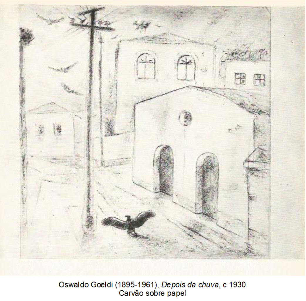 83. A vulgaridade do meio, assim como a do assunto, não é avessa à atividade poética. Ela é a instância possível da poética no contexto da modernidade. O olhar sensível aos eventos sem importância, para o homem absorto em positividades, faz de Goeldi um artista desperto para as sutilezas do mundo, como em Depois da chuva [ Figura 16 ], na figura do urubu que abre suas asas para livrar-se das gotas de chuva e lançar voo. Os temas consagrados, ou considerados elevados, pouco tem a ver com as imagens ricas, próprias para o sonhador. O verdadeiro sonhador é um ser destemido que repudia as imagens convencionais. Para se lançar nas profundezas da vida onírica é preciso buscar as imagens novas, a uma nova intelecção do mundo. Há em toda obra de Goeldi, uma recorrente transfiguração daquilo que para nós é banal. De fato, tudo no Brasil era um estranhamento perene para Goeldi e todo estranhamento é acompanhado de certo encantamento: