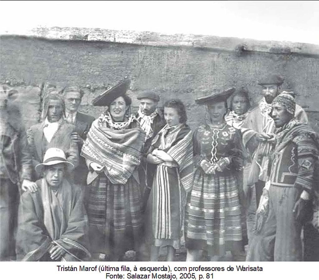 8. No meu entender, coexistiram em Warisata os dois tipos de indigenismo diferenciados por Mirko Lauer em Andes Imaginarios: o indigenismo-1, ou sociopolítico; e o indigenismo-2, de natureza estética.[4] Por um lado, foi muito característico entre os indígenas de Warisata o trabalho de conscientização política de cunho abertamente marxista – na Figura 2, por exemplo, podemos ver o trotskista Tristán Marof junto com professores de Warisata. Por outro lado, procurou-se estabelecer um tipo de educação autodeterminada, baseada em uma concepção de educação total que renunciava a todas as regulamentações ditadas por horários e currículos praticados em outras escolas da época, aí incluídas tanto as de ciências agrícolas práticas quanto a formação artística em ateliês de artesanato, pintura, música, etc.[5]