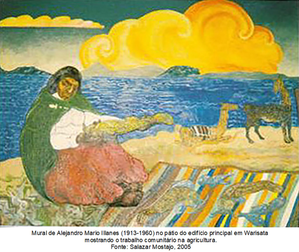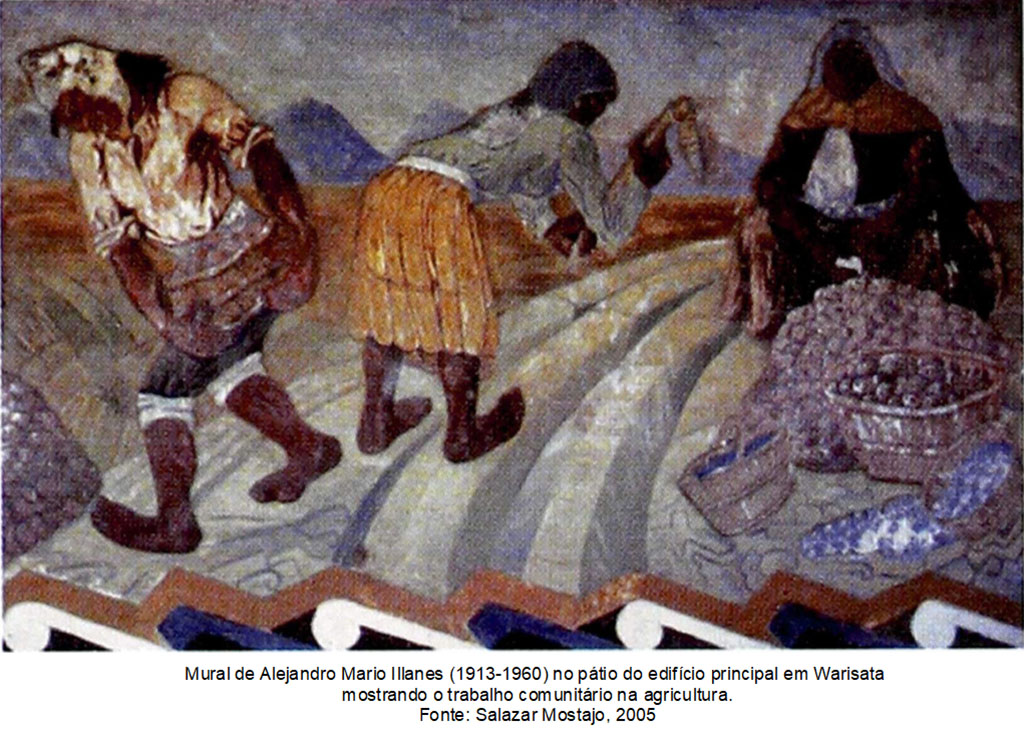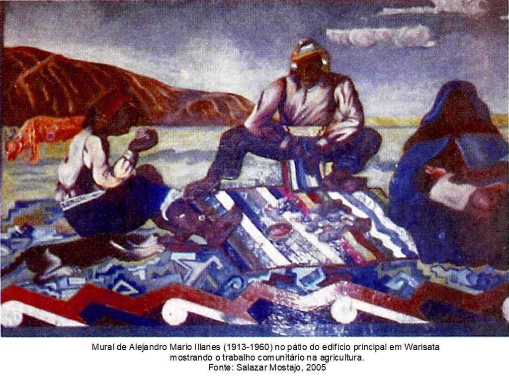 11. Os murais de Alejandro Mario Illanes no pátio do edifício principal de Warisata [ Figura 7, Figura 8, Figura 9 e Figura 10 ], que ilustram muito bem esse trabalho comunitário nas áreas que faziam parte do currículo de Warisata, já foram objeto de um estudo recente e perspicaz, razão pela qual me abstenho aqui de analisar o trabalho de Illanes.[8] No entanto, há outros murais que, embora geograficamente não estejam e nunca tenham estado em Warisata,[9] mantêm vínculos íntimos com a Escola-Ayllu. Esse é o caso de A criação de Warisata [ Figura 11 ], que nos dá um amplo panorama do trabalho educacional na escola. Seu autor é Carlos Salazar Mostajo, ex-professor em Warisata e, mais tarde, até sua morte, professor de História da Arte na Universidad Mayor de San Andrés, em La Paz.