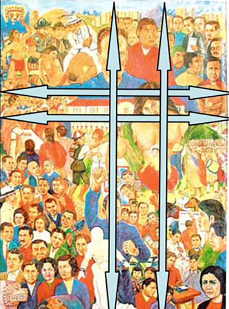 15. Na parte inferior esquerda, começando no plano mais próximo da pintura, estão as representações de divindades mesoamericanas presentes em Warisata na forma do Pavilhão Mexicano visto acima [ Figura 3 , Figura 4 e Figura 5 ]. Assim como a Pachamama personificada como indígena, essas divindades também têm sua contraparte acima, no divino sol andino mostrado no canto superior esquerdo. Além disso, vemos no lado esquerdo muitos mestiços e brancos, provavelmente professores de Warisata, que coparticiparam, com suas pás, na construção da escola. E, finalmente, podemos observar acima deles, mas ainda dentro do recinto protetor constituído pelos muros de Warisata e pelos braços de Pérez, um grupo de indígenas que evocam, com seus chullos e trajes, a Ulaka, a guilda dos anciãos e sábios ou o Parlamento Amauta, como também era conhecido em Warisata.