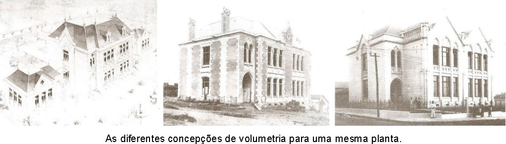 Pela grande demanda da época, alguns arquitetos apenas projetaram fachadas diferentes para plantas iguais [Figura 11], desenhadas por outros profissionais, "ficando a autoria do projeto sempre referida ao autor das fachadas [...] Alguns poucos projetos de grupos escolares foram elaborados por um único profissional e com características personalizadas, diferentes, portanto, dos projetos-tipo"[38].
