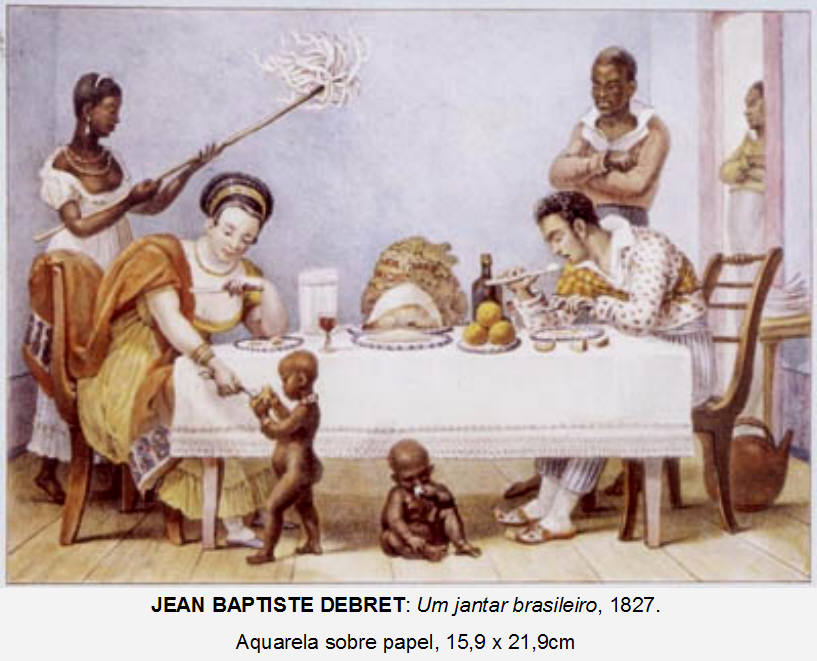 Numa aquarela realizada no ano em que chega ao Brasil, Debret na pensão, o artista qualifica esse dilema. A ironia manifesta-se na oposição entre as figuras do pintor sentado à mesa e do escravo ao fundo, carregando uma bandeja. A presença do escravo é ambígua. Apresenta-se como ponto de convergência das linhas que formam a perspectivação do assoalho e do teto do albergue. Ao ocultar o ponto de fuga, converte a parede às suas costas num fundo mais ou menos difuso e aproxima o olhar para a cena central: o artista sentado diante da mesa. Entretanto, as funções estruturantes da figura do escravo só podem aparecer de forma dubitativa, obscurecida pela área de sombra da aquarela.