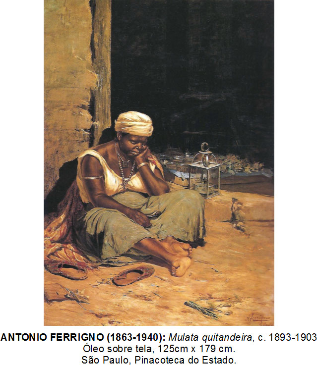 21. Antonio Ferrigno passou 12 anos no Brasil, mais precisamente em São Paulo, onde ficou conhecido sobretudo por retratar fazendas de café. Suas telas mostravam as paisagens e os trabalhadores, na maioria negros, em suas atividades. Na cidade, interessava-se por cenas de gênero e pelos tipos comuns como a Mulata quitandeira [Figura 8]. O quadro lembra certas aquarelas de Jean-Baptiste Debret (1768-1848), feitas décadas antes, com as escravas de ganho, que passavam o dia nas ruas vendendo frutas e doces. A quitandeira de Ferrigno, no entanto, não oferece seus produtos: está sentada e cansada. Não é, também, uma figura genérica: o pintor imprimiu individualidade nos traços da mulher. Mas seu olhar é o de um estrangeiro, que parece se encantar mais com os detalhes, a ornamentação de colares e pulseiras. Há ainda a luminosidade que incide sobre a figura, para acentuar o tom de sua pele. O corpo possui volume e se destaca na cena. É um corpo forte, acostumado, possivelmente, ao trabalho braçal. Mesmo que a intenção do artista tenha sido a de se utilizar de uma imagem sentimental da mulher negra para angariar simpatias em premiações de salões, como sugere Maraliz de Castro Vieira Christo,[13] no nosso entender a sua quitandeira vai além: a luz baixa, os tons terrosos, o lugar pobre, os poucos objetos (ervas, chinelos) em desordem sugerem um futuro sem perspectivas.