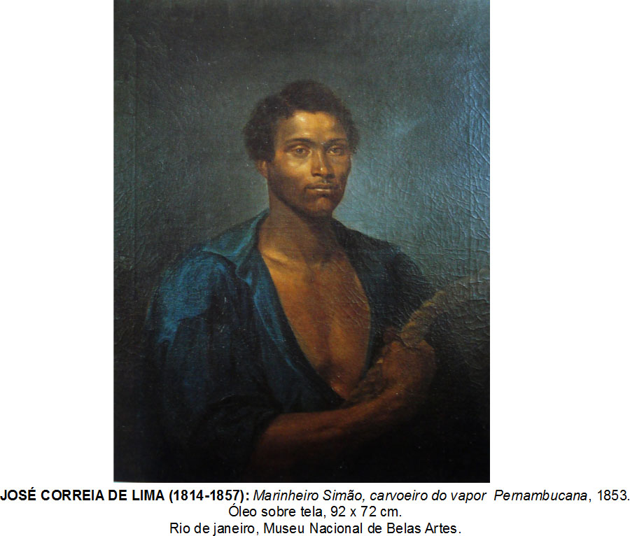 7. José Correia de Lima (1814-1857) pintou, em 1853, o Retrato do intrépido Marinheiro Simão Marinheiro Simão, carvoeiro do vapor Pernambucana [Figura 3]. Nesse quadro, é retratado um negro chamado Simão, um homem livre que, durante um naufrágio, atirou-se nas águas e resgatou treze pessoas. Após o ato, seu nome foi divulgado por vários defensores da causa abolicionista como prova cabal de que os negros não eram inferiores nem física nem moralmente. Apesar de a obra mostrar um homem que parece posar para ser retratado, ela funciona menos como um retrato e mais como uma pintura histórica: trata-se de um caso excepcional, e a obra pôde reivindicar seu lugar no salão oficial de 1859 em grande medida por ser não o retrato de um homem comum, mas sim de um herói que, em uma ação audaz, participou de um evento digno de exaltação, que podia se juntar a um conjunto de outros grandes feitos que legitimavam a grandeza do Império.[3]